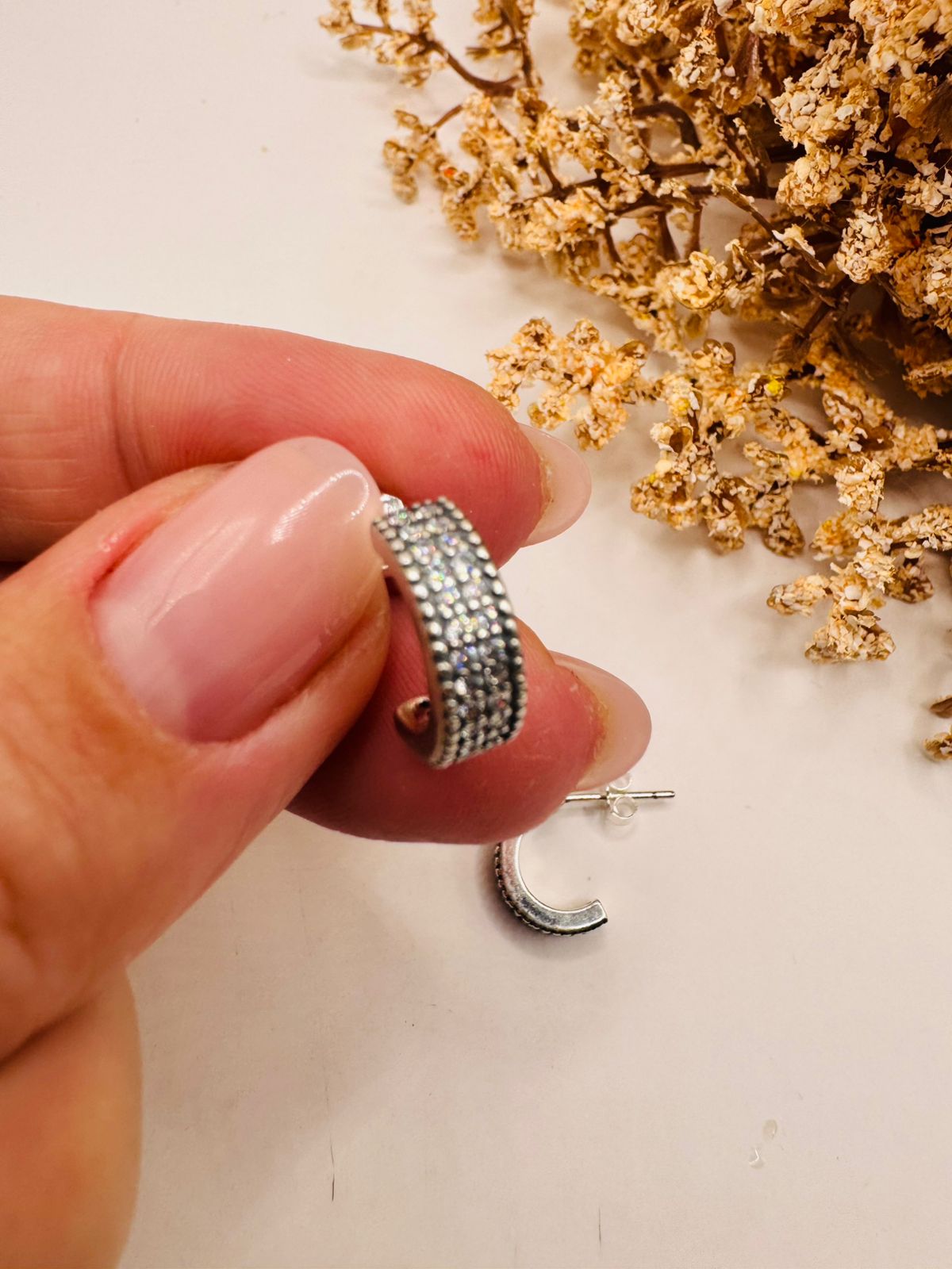 Brinco meia argola cravejada com banho de ródio